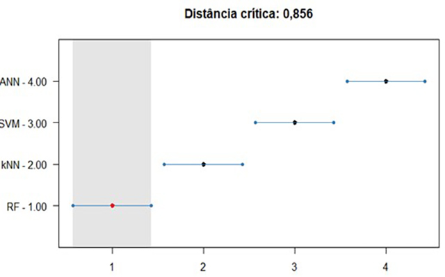 Em posse dos valores de Kappa, obtido em cada repetição, utilizou-se o teste estatístico de Friedman (1940) e Nemenyi (1963) para verificar a existência de diferenças significativas entre os algoritmos ao nível de significância de 5%. Quando a hipótese nula é rejeitada (p-valor < 0,05), entende-se que há pelo menos um modelo (algoritmo) com desempenho significativamente diferente dos demais (Demsar 2006). Posteriormente, foi realizado uma análise comparativa, identificado o melhor algoritmos para a identificação dos usos em áreas de Caatinga.