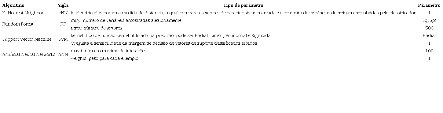A classificação utilizada no presente estudo foi do tipo supervisionada, realizada por meio da técnica de aprendizado de máquina baseando-se nos algoritmos kNN, RF, SVM e ANN. Para cada algoritmo foi modelado a configuração ótima, de acordo com os parâmetros exigidos, conforme exposto na Tabela 1. Desse modo, foram testados diferentes parâmetros como o número de neurônios para o algoritmo ANN, tamanho da árvore para o RF, valor de custo e tipo de Kernel para o SVM, e por fim, o número de vizinhos ótimo para o classificador kNN.