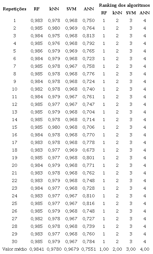 Na Tabela 2 são apresentados os algoritmos de aprendizado de máquina e os respectivos valores Kappa obtidos no processo de validação cruzada, baseando-se nas 30 repetições realizadas. A partir dos valores de Kappa foi elaborado o ranking dos algoritmos, de modo que em todas as repetições os algoritmos apresentaram o mesmo comportamento.