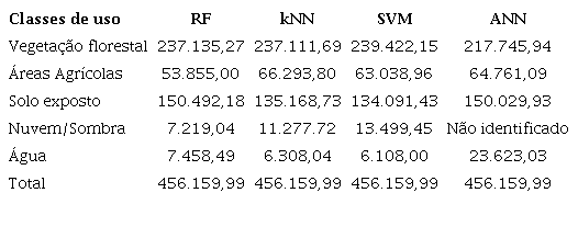 A quantificação do mapeamento obtido pelos algoritmos de aprendizado de máquina pode ser visualizada na Tabela 3. Destaca-se que a organização dos dados se deu a partir do ranking do melhor algoritmo. Observou-se a similaridade nos valores de área para a classe de vegetação florestal nos algoritmos RF, KNN e SVM. Os algoritmos kNN e SVM apresentaram maior confusão na classe nuvem/sombra, o que contribuiu para a redução dos valores de Kappa e consequentemente, perda da qualidade das classificações.