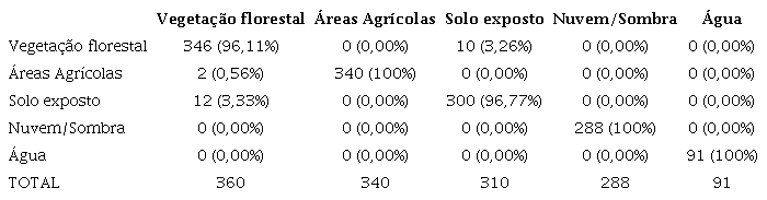 Na Tabela 4 encontram-se os valores da matriz de confusão obtida para o algoritmo de melhor desempenho nos valores de Kappa, o RF. Assim, as colunas referem-se à classe estimada no processo de classificação e as linhas a verdade terrestre, em que a diagonal principal representa previsões corretas e a demais indicam as incorretas.