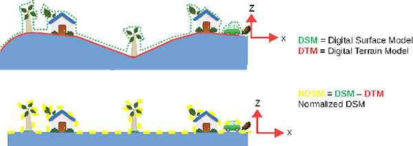 The difference between DSM and DTM provides a third model: the DEM (Digital Elevation Model), which represents only the height of objects above the terrain (Dong & Chen 2018; Shan & Toth 2018). Figure 1 illustrates the DTM and DSM models.
