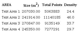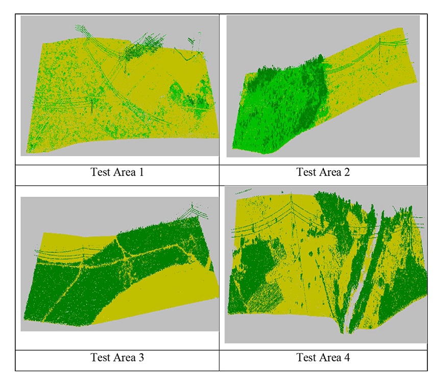 The first area comprises a flat region with little vegetation. The transmission lines and a small construction stand out. The second region is characterized by a strong slope, which can be divided into two parts. In the low part there is dense vegetation and, in the highest part, the vegetation is low and only the transmission line stands out from the land. The third test region is completely covered by dense vegetation, also having a slightly inclined relief. The fourth region is the most complex, as it contains a valley with the presence of a river. In the region close to the river, the presence of dense vegetation is more visible and the slope of the terrain is larger. The size of each area, the total points present in these areas and the density of points per square meter, are described in Table 2.