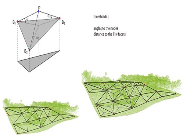 This initial grid can be progressively densified, including new points that can also be considered from the terrain, from which the method name derives. For this, all the remaining points are analyzed. First, it is determined within which triangle of the TIN mesh the point falls. Then two parameters are analyzed, as shown in Figure 4: the first is the distance from the point to the vertices of the triangle and the second is associated with the angles formed by the plane of the corresponding triangle and the lines that join the point and the vertices. Based on these parameters, it is determined if the point is close to the surface of the digital model or if it is too far away. If it is far away, it is considered a peak associated with an object above the ground and this point is discarded. If it is considered close, it is included in the set of “terrain” points and after the iteration a new terrain model is produced. The process is stopped when there are no more points to be added to the “terrain” set.