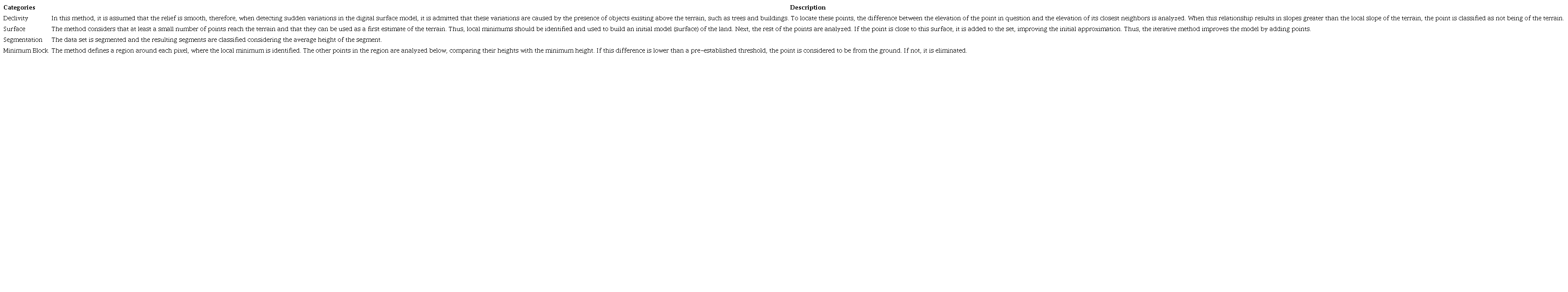 Applications of Airborne LiDAR technology related to surface representations, with studies aimed at the generation of large-scale TMD and high-precision mappings, were advocated in the late 1990s (Vosselman 1999). These studies continued with several studies in the 2000 (Chen et al. 2007; Schuffert 2013; Sithole & Vosselman 2004; Vögtle & Steinle 2005; Vosselman 2000). The main reference for comparing several methods of obtaining Digital Terrain Models from laser scanner data filtering is the work of Sithole and Vosselman (2004). Sithole and Vosselman (2004) compared the performance of eight filtering algorithms on the International Society of Photogrammetry and Remote Sensing reference dataset ISPRS) and found that adaptive triangulated irregular network (ATIN) also referred to as progressive TIN densification, PTD) outperformed others, as it used more context (Chen et al. 2021). In this study, the methods are grouped into the following categories (Table 1).