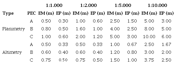 The discussion of the geometric quality of a letter was traditionally based on Decree # 89.817, of June 20th, 1984, Brazil. However, with the emergence of new methods of cartographic collection and representation, this decree was revised, and today it is common to follow the specifications of ETADGV, which establishes a new Standard of Cartographic Accuracy designed to meet Digital Cartographic Products (PEC-PCD) (DSG 2011). For the classification of a product in one of the PEC-PCD classes, statistics of 90% of the points collected in the cartographic product are considered in relation to the coordinates of the homologous points collected in the “most accurate source”. The altimetric and planimetric quality specifications, in terms of PEC-PCD, are shown in Table 3. The discrepancies between the coordinates of the homologous points must be equal to or less than the maximum error (EM) and standard error (EP) predicted for each scale. Additional information regarding the LIDAR point classification algorithms can be obtained from Schimdt, Rotteensteiner and Sörgel (2012) and Kim and Sohn (2011).