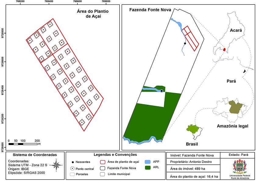 A área de desenvolvimento desse trabalho foi no município de Acará que pertence à mesorregião do nordeste Paraense e a microrregião de Tomé-Açú, na Fazenda Fonte Nova, próximo à rodovia PA 256, km 45. O local possui cultivo de açaí (Euterpe oleiracea Mart.) e é dividido em 4 talhões, totalizando de 16,4ha entre as coordenadas geográficas: 02º 27' 00'' e 02º 27' 28,8'' de latitude Sul, 48º 34' 26,4'' e 48º 34' 40,8'' de longitude Oeste.