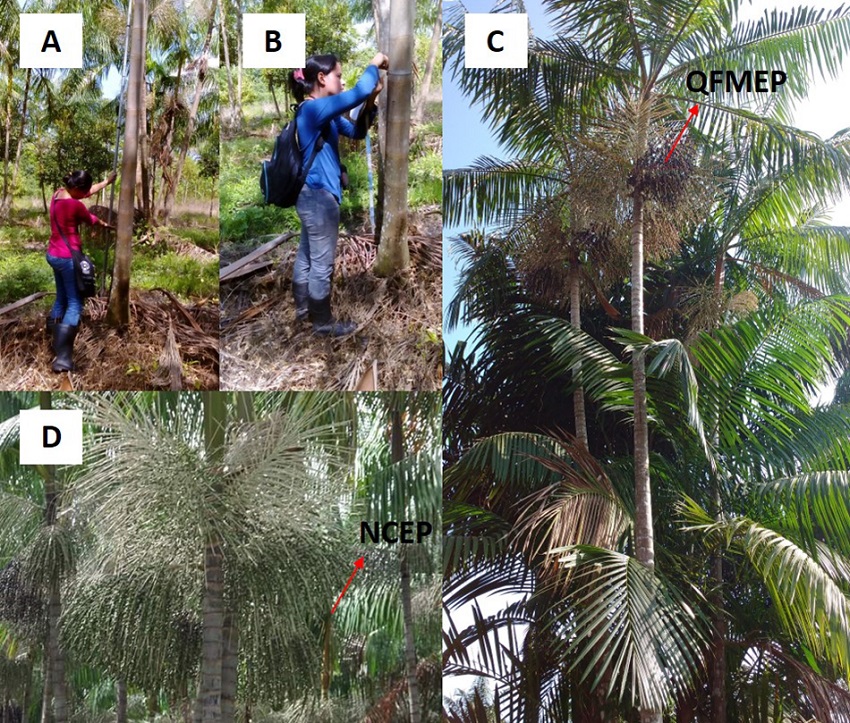 Para a amostragem dos atributos da planta foram coletadas na área de estudo, informações de 10 plantas por parcela, situadas o mais próximo do ponto amostral da malha. Em cada planta foi obtida os seguintes dados: altura, circunferência (CIR), número de cachos no estipe principal (NCEP) e quantidade de frutos maduros em ponto de colheita no estipe principal (QFMEP), apresentada na Figura 2. As medidas foram feitas de forma manual, através do uso de fita métrica, uma vara métrica e anotações das observações visuais em campo. Essa metodologia é similar aos estudos de Gama (2012), Aguiar (2016) e Mendonça & Moreira (2020).