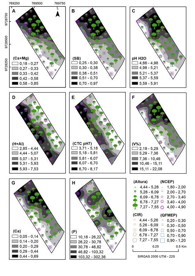 Observa-se nos mapas de krigagem (Figura 3) a distribuição dos atributos químicos do solo foi de grande variação na área, confirmando os resultados preliminares da análise descritiva (Tabela 1). Esses resultados são fundamentais, pois mostram as menores concentrações dos atributos: Cálcio + Magnésio, Fósforo (P), Cálcio (Ca) e Soma de Bases (SB) na borda inferior do plantio, mesmo após a adubação de produção, evidenciando assim a aplicação do nutriente em questão no decorrer da área de cultivo, a taxas variadas, visando à homogeneização da fertilidade do solo, minimizando as chamadas manchas de fertilidade do solo (Carneiro et al. 2017).