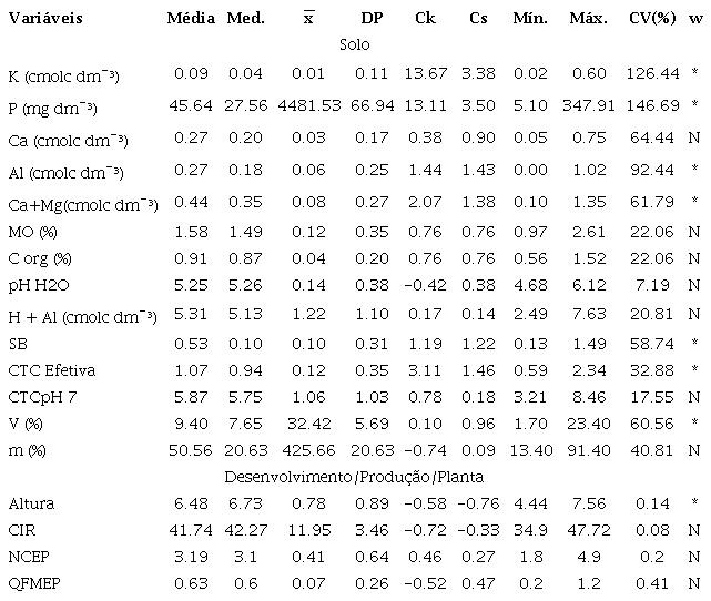 Os dados obtidos foram submetidos a uma análise exploratória pelo método da estatística descritiva, obtendo-se média, mediana, valores mínimos e máximos, desvio padrão, coeficiente de variação, curtose, assimetria e coeficiente de variação. A hipótese de normalidade foi realizada através do teste de Shapiro-Wilk a 5% de probabilidade. Para as variáveis que não apresentaram distribuição normal, procedeu-se a transformação logarítmica dos dados verificando se estes seguiam a distribuição log-normal. Para obtenção dos cálculos utilizou-se o software livre BioEstat, versão 5.0.
