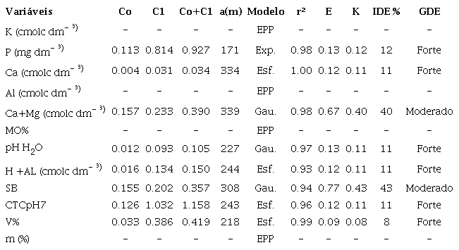 Na Tabela 2, mostra-se a análise geoestatística dos atributos químicos do solo, no qual as variáveis: potássio (K), Alumínio (Al), Matéria Orgânica (M.O) e Saturação por alumínio (m%) não apresentaram dependência espacial. Para estes dados, tem-se uma distribuição completamente aleatória, não tendo sob o ponto de vista geoestatístico, uma função que descreva sua variação no espaço. Isso denota que o número de amostras utilizadas para o estudo desses parâmetros não foi suficiente para detectar dependência espacial e, nesses casos, uma maior densidade de amostras poderia ser considerada para uma reavaliação de sua dependência espacial (Silva et al. 2020).