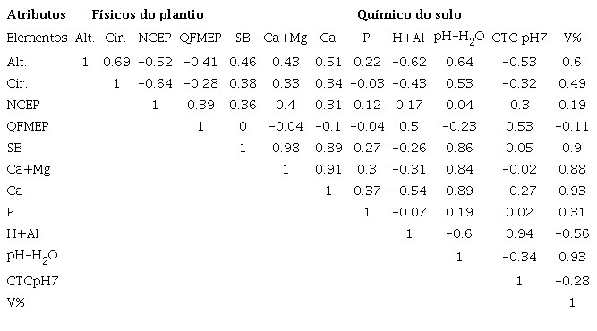 Essa associação das variáveis em estudo se faz necessária para entender as razões dessas variações, cujo é reflexo de vários das interações, tais como: formação do solo, manejo do solo e da cultura. A Tabela 3 apresenta a matriz de correlação entre os atributos químicos do solo e do plantio em que observou-se, que no geral, os atributos físicos da planta (Altura, Circunferência, NCEP e QFMEP), apresentaram moderada a fraca correlação com os elementos químicos do solo, o que pode ser justiçado pelas manchas de baixa fertilidade do solo presente na área, apesar da adubação de produção. Além disso, o solo em questão caracterizou-se como ácido o que pode interferir na absorção de nutrientes.