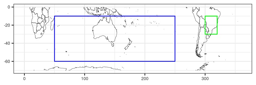 O ray tracing permite investigar a trajetória seguida pelas ondas de Rossby a partir de diversas fontes e diferentes condições iniciais. No presente experimento, foram rastreadas todas as ondas geradas nos pontos de grade da região delimitada pelo retângulo azul na Figura 1 (50ºL-110O/60ºS-10ºS) com distanciamento de 2,5º entre os pontos, tempos totais de integração de 3, 4, 5 e 7 dias e números de onda total (K) 2, 3 e 4. Após o rastreamento, as trajetórias das ondas que em algum momento cruzaram a região de interesse delimitada pelo retângulo verde na Figura 1 (60ºW-40ºW/30ºS-10ºS), foram selecionadas. No final, foram selecionadas as trajetórias das ondas de Rossby com K=2 e K=3, pois o objetivo é investigar ondas planetárias que estão no contexto das ondas de frio, além de 5 dias de integração. Acima de 5 dias, os traçados de ondas se deslocam muito ao norte da região de interesse (distantes da caixa verde na Figura 1) e abaixo disso, ficam muito a sul ou não alcançam a região de interesse. Para o cálculo do ray tracing é utilizada uma ferramenta desenvolvida na linguagem R ( R Core Team 2020) disponível no repositório oficial do R (CRAN - https://cran.r-project.org/web/packages/raytracing/index.html mais informações em https://github.com/salvatirehbein/raytracing).
