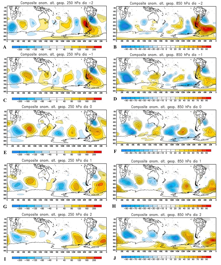 O deslocamento das anomalias positivas de altura geopotencial em 250 hPa do oceano Pacífico para o Atlântico entre os dias -2 ( Figura 5A) e 0 ( Figura 5E), pode ser explicado por situações de quebra da onda de Rossby, que levam a situações de escoamento atmosférico com aparência de bloqueio do tipo dipolo ( Iwabe & Da Rocha 2009; Nascimento & Ambrizzi 2002; Postel & Hitchman 1999; Sprenger,Wernli & Bourqui 2007). Deste modo, sugere-se que o padrão com característica similar a de bloqueio dipolo no oceano Atlântico, é importante para a manutenção do ar frio de altas latitudes em direção à área situada entre as circulações dos anticiclones pós-frontais sobre o continente e o ciclone extratropical no oceano Atlântico ( Figuras 5B, 5D e 5F). Para o dia 1 ( Figura 5G e 5H), as anomalias de altura geopotencial desintensificam em relação ao dia 0 ( Figura 5E e 5F), mas ainda mostram um trem de ondas de Rossby ao redor do HS. Já para o dia 2 ( Figura 5I e 5J) não existem anomalias significativas próximas ao Brasil.