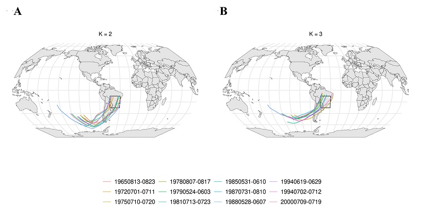 Figura 6 mostra as trajetórias seguidas pelas ondas de Rossby com K=2 ( Figura 6A) e K=3 ( Figura 6B) para cada um dos 12 eventos de ondas de frio a partir de uma região em aproximadamente 45ºS/130ºO, similar à Figura 5A, onde a composição da anomalia da altura geopotencial em 250 hPa exibe a amplificação das ondas a partir dessa região do oceano Pacífico sul. Existe uma semelhança com relação a região fonte destas ondas para todos os eventos de onda de frio, com exceção daquela ocorrida em 1985 cujo início da trajetória de onda ocorre à noroeste dos demais eventos (está além do escopo deste estudo detalhar as particularidades deste caso de 1988), porém segue a mesma trajetória que os demais eventos estudados.