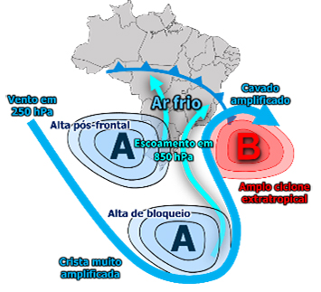 Marengo et al. (2002) estudaram o comportamento da circulação no HS durante invernos rigorosos na Região Sul e Sudeste do Brasil entre os anos de 1979 a 1998. Cerca de 12 dias antes do auge do frio no Brasil, um duplo trem de ondas se organiza do oceano Pacífico (próximo da Austrália) em direção à AS em formato de arco, embebido no jato subtropical e polar. Entretanto, as ondas entram em fase na parte oriental do oceano Pacífico e sobre o continente sul-americano, resultando em extensas áreas de anomalias da circulação e num escoamento gélido de sul sobre áreas subtropicais e tropicais da AS, padrão semelhante ao descrito por Müller & Berri (2012).