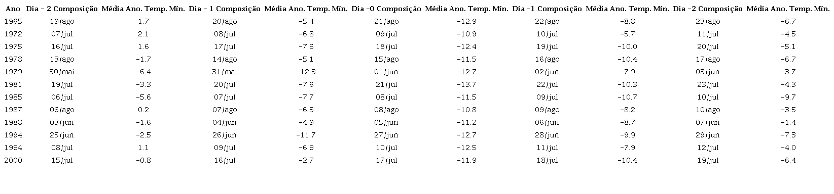 De posse das anomalias diárias (às 1200 Z) das variáveis, selecionaram-se os dias -2, -1, 0, 1 e 2 para construção das composições das 12 ondas de frio ( Tabela 1), seguindo a mesma metodologia de Müller & Berri (2012) com relação aos dias das composições, onde o dia 0 corresponde ao dia de pico do extremo frio, isto é, o dia em que a média da anomalia da temperatura mínima diária foi a menor para cada evento. Os valores de anomalia da temperatura foram obtidos das estações meteorológicas do centro-norte do estado de São Paulo e sul de Minas Gerais, conforme o estudo de Lucyrio, Reboita & Albieri (2019).