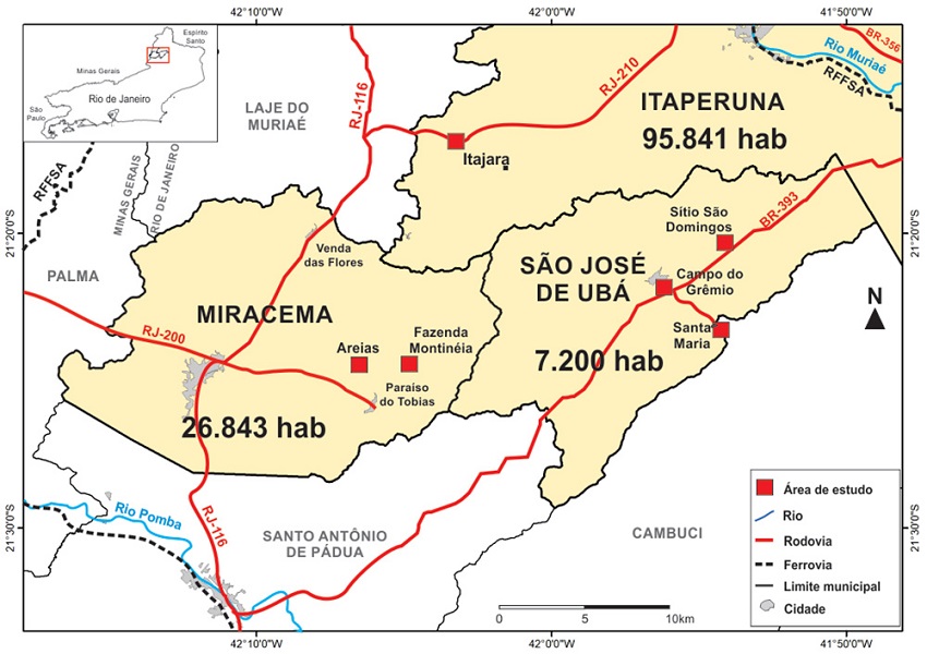 A área de estudo compreende a região noroeste fluminense, nas localidades rurais dos municípios de Miracema, São José de Ubá e da porção sudoeste do município de Itaperuna, (Figura 1) (IBGE 2015).