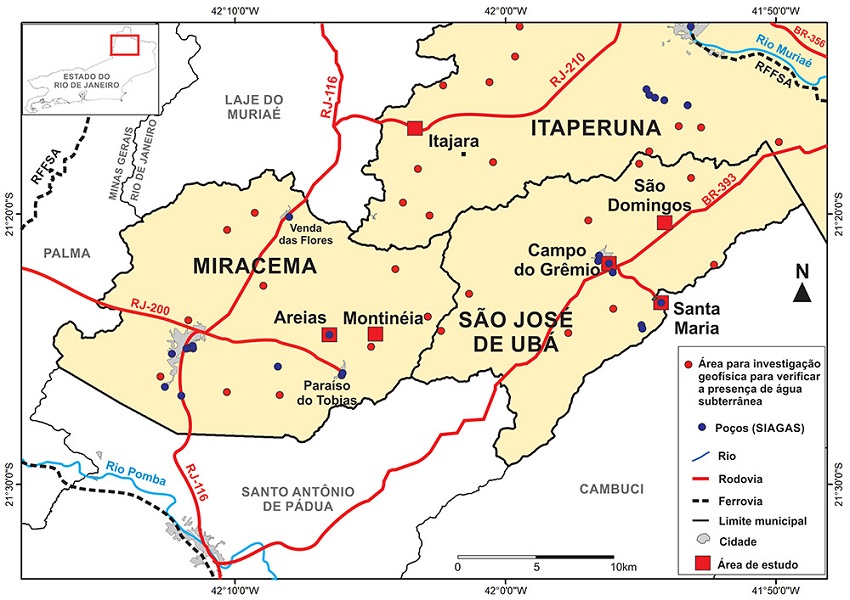 A região noroeste do estado do Rio de Janeiro situa-se no sudeste do Brasil e devido às características naturais da região, apresenta um clima com período seco de 4 a 6 meses (Empresa Brasileira de Pesquisa Agropecuária 2019). A deficiência hídrica dos municípios é aumentada substancialmente em razão do acentuado índice de desmatamento, uso e ocupação do solo com atividades agropecuárias sem manejo sustentável e elevado escoamento superficial. Segundo a Agência Nacional de Águas (2017), a partir de 2014, longos períodos de estiagem contribuíram para uma crise hídrica na região sudeste do Brasil. De acordo com Cunha et al. (2019), o pico de seca severa ocorreu em 2013/2014, com índice de 42,6% em relação ao período avaliado de 2011 a 2019. A escassez de chuvas, as temperaturas muito elevadas e o alto consumo de água pela população destacaram-se como os elementos mais importantes deste cenário. Slater (2019) inferiu como fatores contribuintes ao panorama de seca uma combinação entre degradação ambiental, mudança climática, falta de manutenção de estruturas e insuficiência de planejamento. No noroeste fluminense, o déficit hídrico subsistiu até 2017, com impactos significativos em sua economia, abrangendo perdas na safra e morte de animais (Empresa Brasileira de Pesquisa Agropecuária 2018). Um balanço hídrico desfavorável exige ações mitigadoras de modo a garantir o fornecimento hídrico sustentável para a população e os ecossistemas. Em vista desses aspectos, o trabalho envolvendo a caracterização ambiental da área de estudo foi conjugado, de forma generalizada e não específica aos mapas geológicos (tipos de rochas e estruturas), e aos perfis obtidos pelos métodos geofísicos Elétrico, Eletromagnético e Magnetométrico, para a obtenção de dados de subsuperfície nos locais indicados pela pesquisa como prováveis fontes para a captação de água. A investigação envolveu as zonas rurais dos municípios, nas quais a demanda por água é maior em função das atividades nas lavouras e criação de animais.