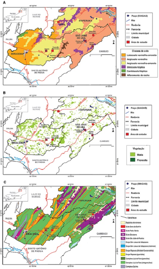 No noroeste fluminense a proeminência das áreas de pastagem na bacia reflete os efeitos dos diversos ciclos econômicos da região, como: café, cana-de-açúcar, algodão e pecuária extensiva. Colinas, morros, morrotes e alinhamentos serranos com direção preferencial das falhas e fraturas das rochas WSW-ENE, caracterizam a geomorfologia da região, com domínio de altitudes entre 100 e 300 metros e elevações máximas de 900 metros. Os solos são classificados como latossolo, argissolo, cambissolo, gleissolo, planossolo hidromórfico e neossoloflúvico (Empresa Brasileira de Pesquisa Agropecuária 2003) e a distribuição pedológica na região pesquisada consta na Figura 2A. A cobertura vegetal é constituída por floresta estacional semidecidual ou floresta subcaducifólia (IBGE 2012; Lumbreras et al. 2004; Soffiati 2018), com fragmentos de vegetação remanescente da Mata Atlântica, de acordo com os padrões demonstrados na Figura 2B.