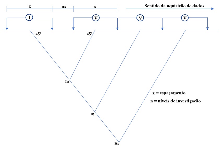 O método detecta na superfície os parâmetros elétricos do fluxo de corrente no subsolo. Na pesquisa utilizou-se a técnica de Sondagem Elétrica Vertical Multi Eletrodo (SEVME) e emprego de injeção de corrente elétrica no terreno por intermédio de uma fonte externa. O seu uso retrata os níveis de resistividade e/ou condutividade elétrica em subsuperfície (Dentith & Mudge 2014; Loke 2000). Utilizou-se o equipamento Syscal Kid Switch na aplicação da técnica SEVME, com arranjo dipolo-dipolo (Figura 3).