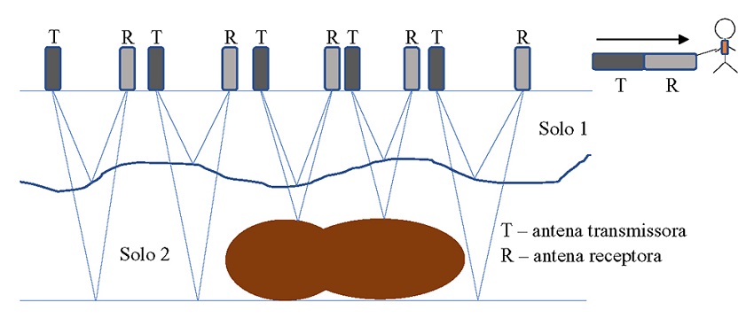 O método baseia-se nos fenômenos físicos da eletricidade e do magnetismo e conjectura a identificação dos contrastes dos elementos em subsuperfície. A profundidade de penetração do sinal depende da condutividade elétrica do meio em que ele se propaga e da frequência emitida pelas antenas do equipamento. As frequências mais altas estão relacionadas à menor profundidade de alcance do sinal e maiores profundidades são atingidas por frequências mais baixas (Akinsunmade et al. 2019). Na obtenção dos dados eletromagnéticos foi usado o equipamento Mala, modelo ProEx e antenas de 50 MHz e 100 MHz, com espaçamento entre antenas de 3.5 metros e 1 metro, respectivamente. O arranjo baseou-se na geometria de afastamento constante (common offset), conforme a Figura 4.