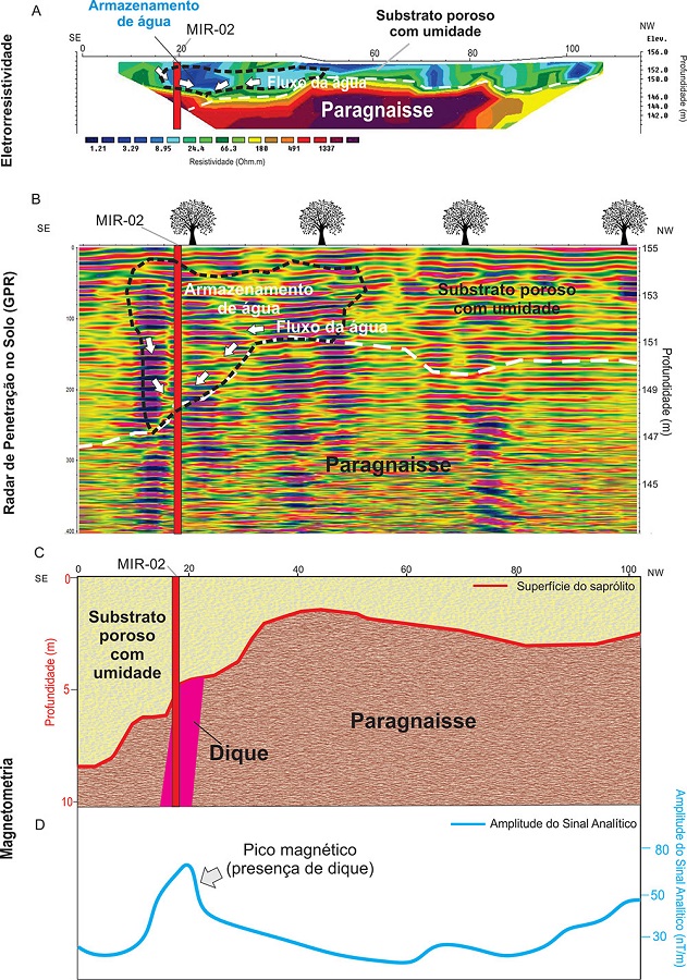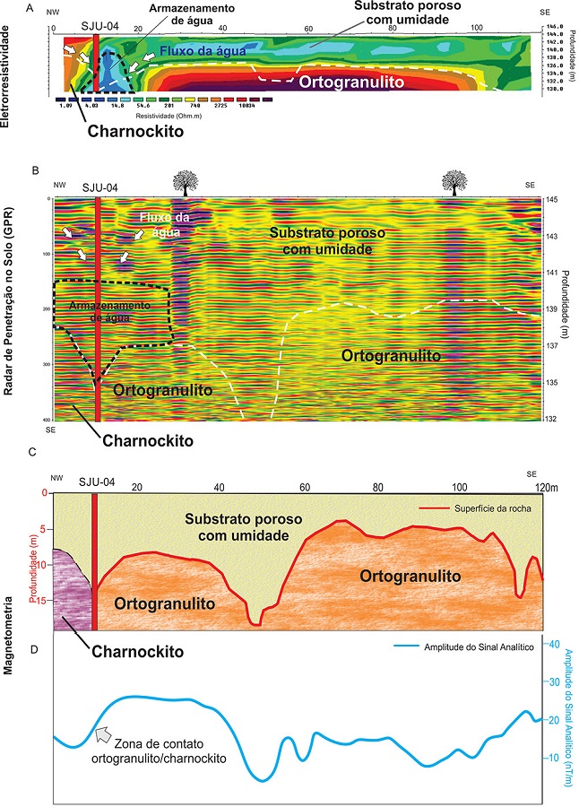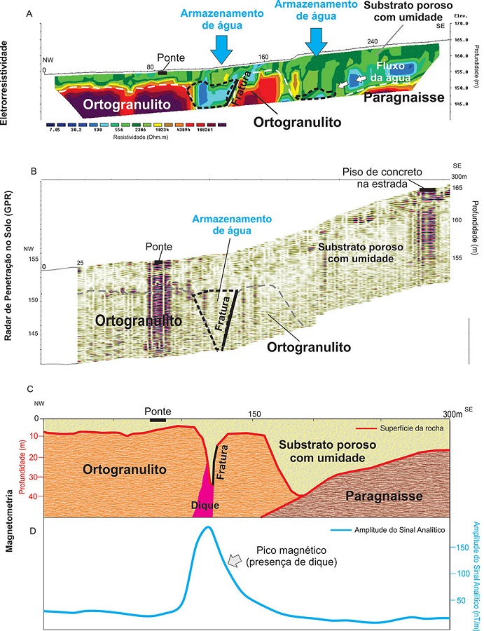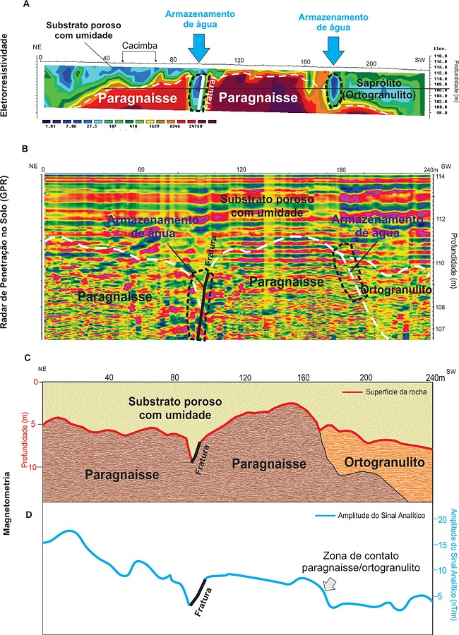 Os perfis de eletrorresistividade, eletromagnético (GPR) e magnetometria exibem duas áreas com grande potencial para a captação de água. A eletrorresistividade (Figura 7A) e o GPR (Figura 7B) indicam a presença de fratura no paragnaisse em profundidades superiores a 10 metros, o que contribui para o armazenamento de água. Os mesmos perfis mostram que a cacimba recebe o aporte de um fluxo de água raso, menor que 3 metros, armazenado no substrato poroso. Os perfis magnéticos do topo do embasamento (Figura 7C) o do Sinal Analítico (Figura 7D) também exibem assinaturas correspondentes à fratura. As respostas magnéticas das rochas refletem susceptibilidades magnéticas distintas (10,2 x 10-6 no ortogranulito e 3,24 x 10-6 no paragnaisse).