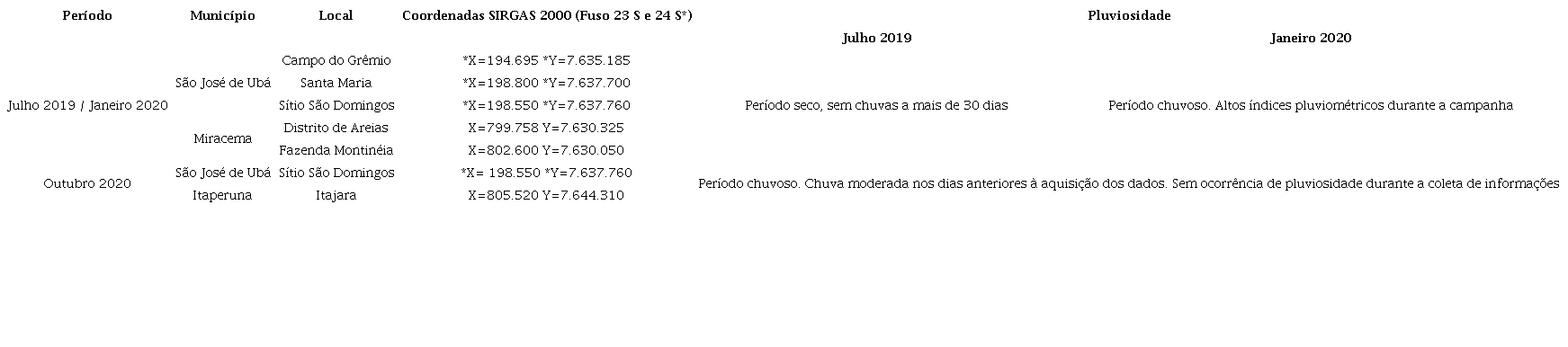 As campanhas de campo ocorreram em diferentes períodos sazonais, em julho de 2019, janeiro de 2020 e outubro de 2020 (Tabela 1), com aquisições de dados pelos métodos geofísicos Eletrorresistividade, Magnetometria e Georadar. As primeiras campanhas foram realizadas em locais onde há poço cadastrado no Sistema de Informações de Águas Subterrâneas - SIAGAS (Sistema de Informações de Águas Subterrâneas 2019) para a calibração dos padrões de referência de potencialidade de armazenamento de água. Os poços serviram para identificar a presença de água nos locais investigados.
