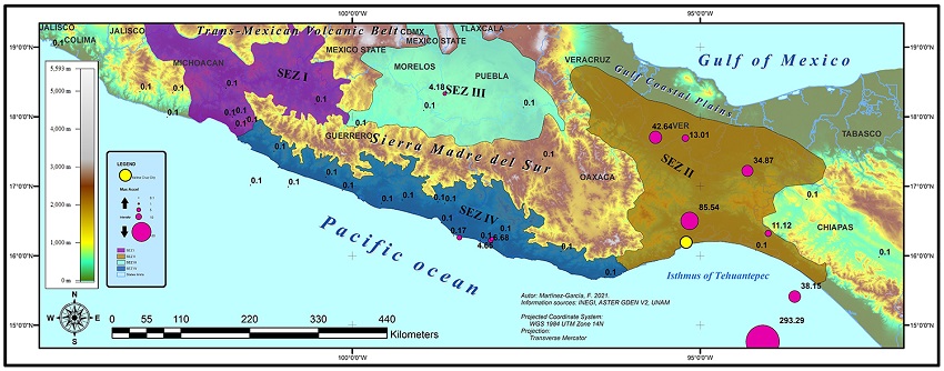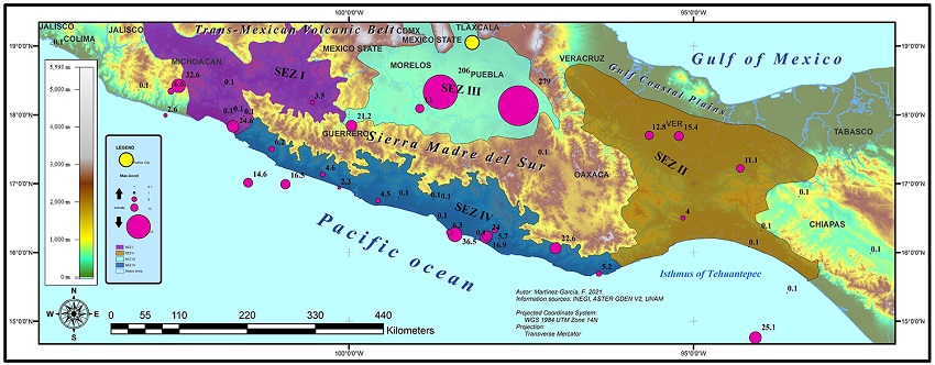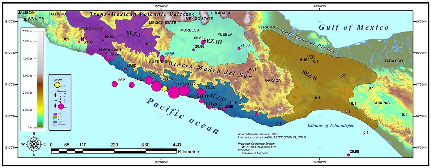 Earthquakes in SEZ I and II have a wider range of influence, greater than 400 km, but have a different path and direction, in SEZ I it is W-E trend, unlike the SEZ II whose trend is SSE-NNW. The geomorphology of these two regions is characterized by the presence of depressions, one corresponding to the basin or depression of the Balsas River which owes its shape to the presence of large mountain ranges, TMVB-SMS. The other depression corresponds to the Isthmus of Tehuantepec, characterized by the presence of plains, minor elevations and continental shelf.