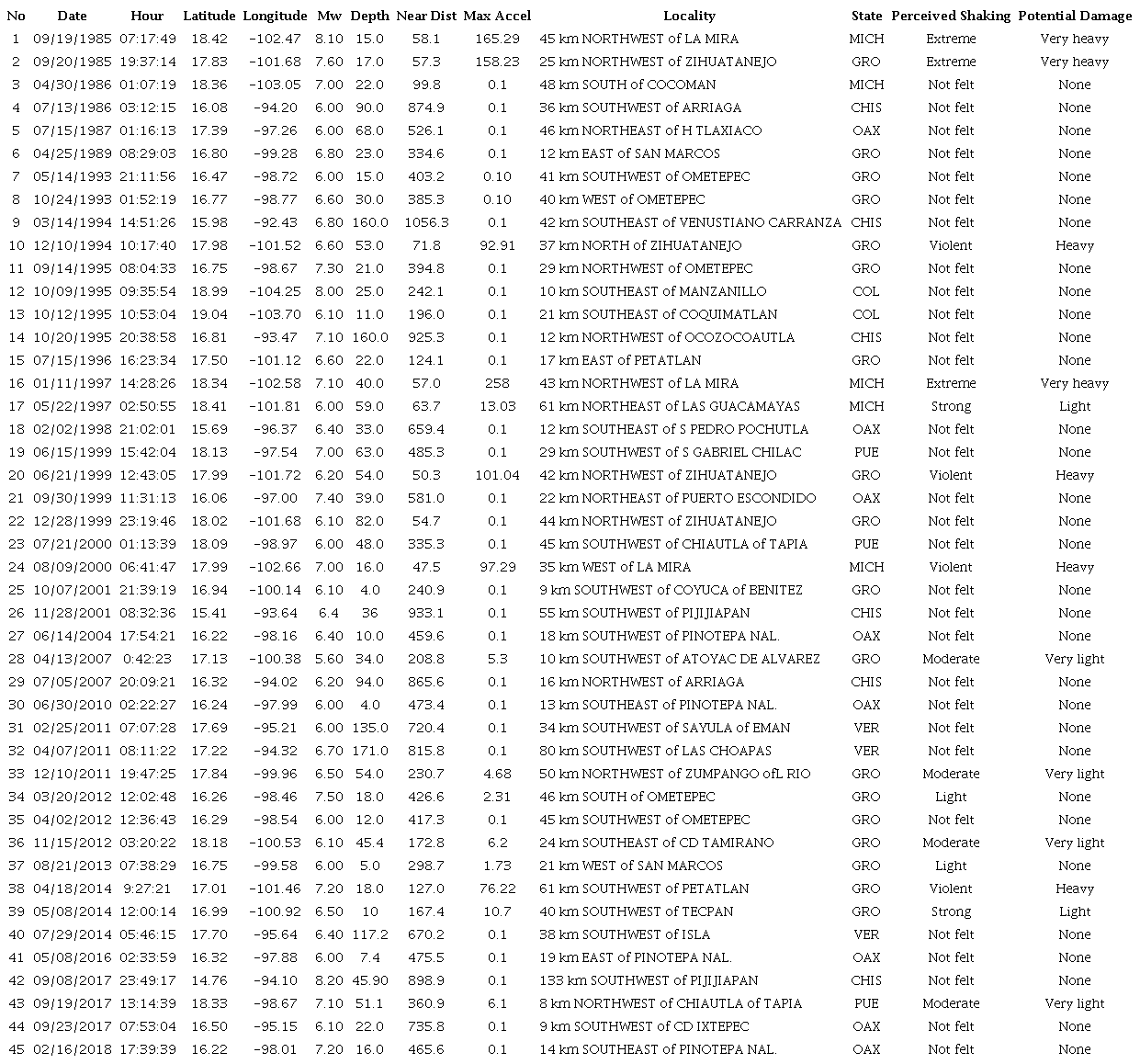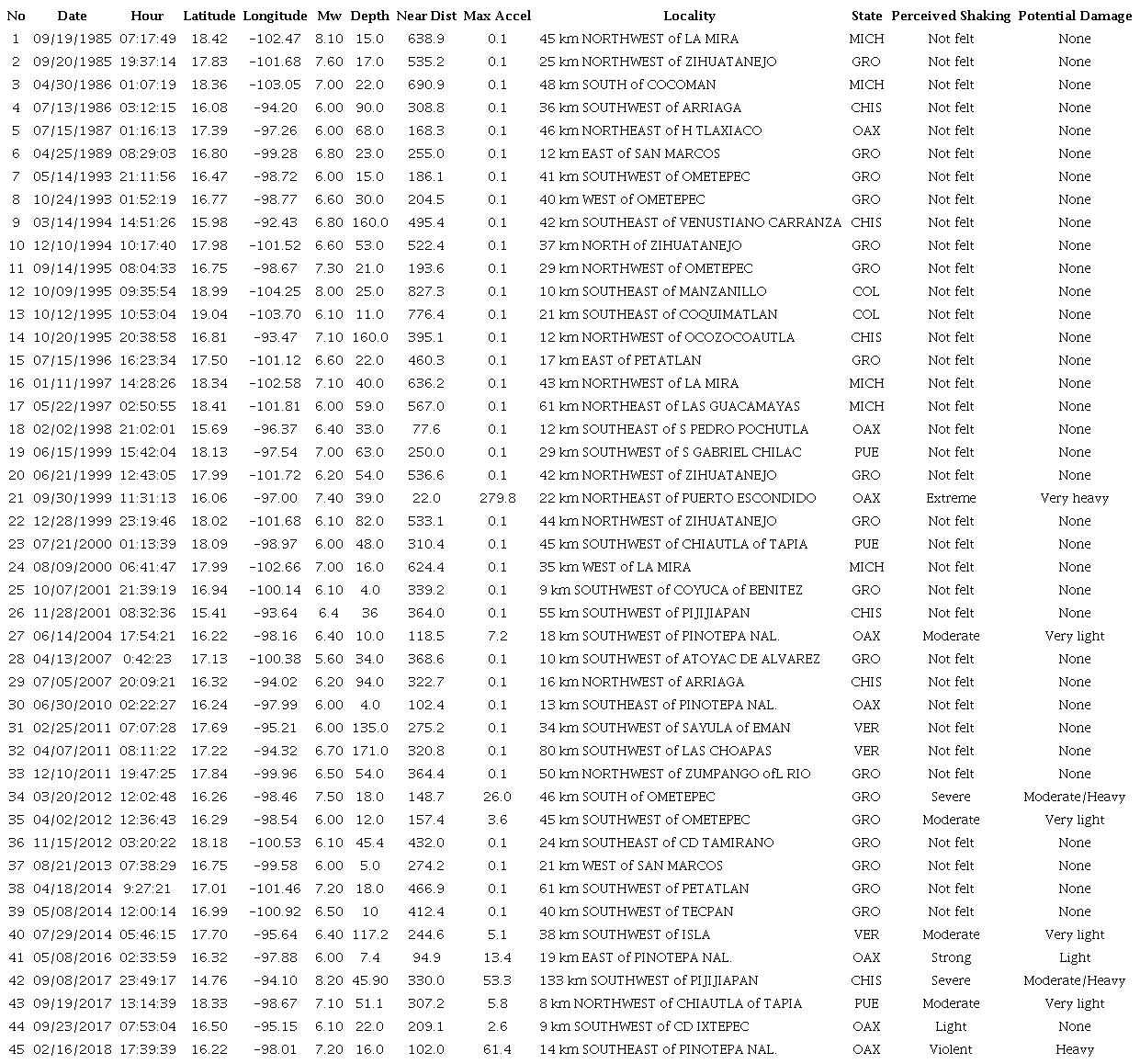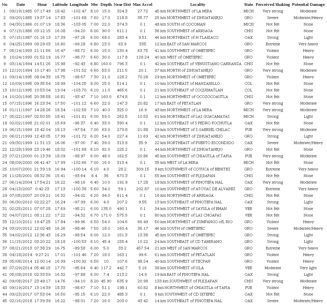 Acceleration files (csv format) for the period 1985 to 2018 were obtained, processing the “Maximum acceleration” values of 45 earthquakes in the range of 6 to 9 degrees on the seismic moment magnitude scale (Mw). The data chosen from each file corresponded preferably to the averages and occasionally, to the highest records for each of the stations involved, in particular within the urban area boundaries of the cities in Mexico City (CDMX), Puebla, Puebla; Lázaro Cádenas, Michoacán and Salina Cruz, Oaxaca, and the resorts of Acapulco, Guerrero and Puerto Escondido, Oaxaca.
