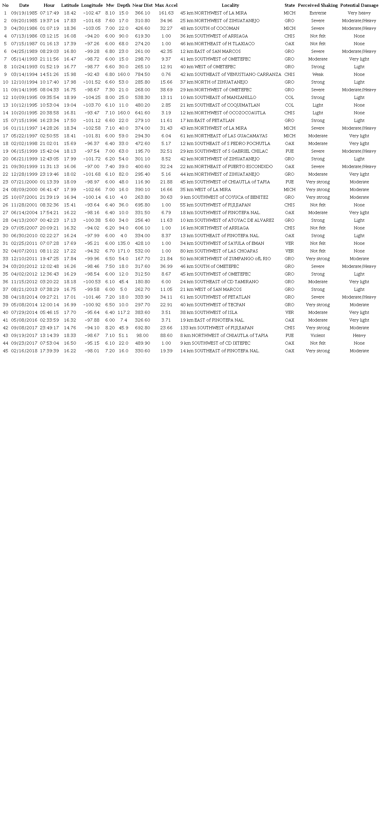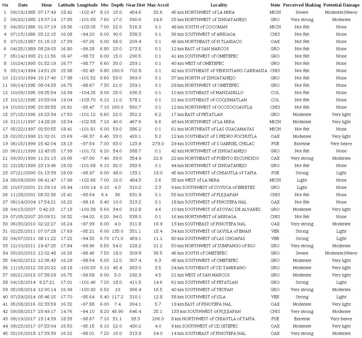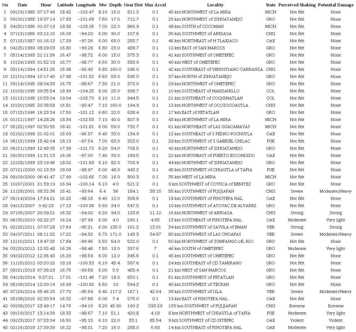 Acceleration files (csv format) for the period 1985 to 2018 were obtained, processing the “Maximum acceleration” values of 45 earthquakes in the range of 6 to 9 degrees on the seismic moment magnitude scale (Mw). The data chosen from each file corresponded preferably to the averages and occasionally, to the highest records for each of the stations involved, in particular within the urban area boundaries of the cities in Mexico City (CDMX), Puebla, Puebla; Lázaro Cádenas, Michoacán and Salina Cruz, Oaxaca, and the resorts of Acapulco, Guerrero and Puerto Escondido, Oaxaca.