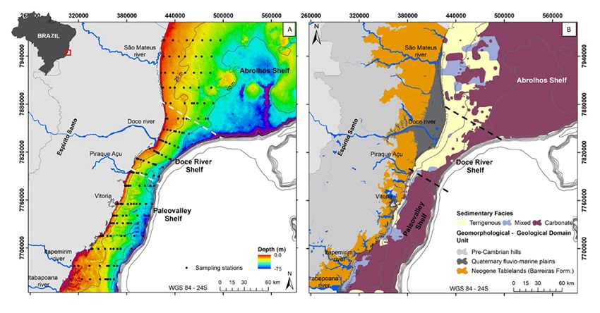 The ESCS can be subdivided into three sectors according to the sedimentary and morphological characteristics: the Paleovalley Shelf, Doce River Shelf, and Abrolhos Shelf (Bastos et al. 2015). The Paleovalley Shelf is located south of the Doce River Shelf, where the accommodation regime is dominant. The shelf and coastal morphologies are irregular along this sector, demonstrating the presence of paleovalleys and hardgrounds in the shelf, and unfilled estuaries and soft cliffs formed by the Neogene Barreiras formation along the coast. This accommodation regime along the ESCS does not represent an erosive shelf but the dominance of carbonate sedimentation, especially at water depths greater than 20 m (Bastos et al. 2015). The Doce River Shelf, in the north-center of the ESCS, has a supply regime with a high terrigenous sediment input. The bottom morphology is regular and is associated with a delta front and prodelta, following the Doce River deltaic plain along the coast (Bastos et al. 2015; Quaresma et al. 2015). The southern Abrolhos Shelf is located in the far north of the ESCS. This sector represents an enlargement of the eastern Brazilian shelf; it presents a supply regime along the inner shelf and an offshore carbonate regime (Bastos et al. 2015).