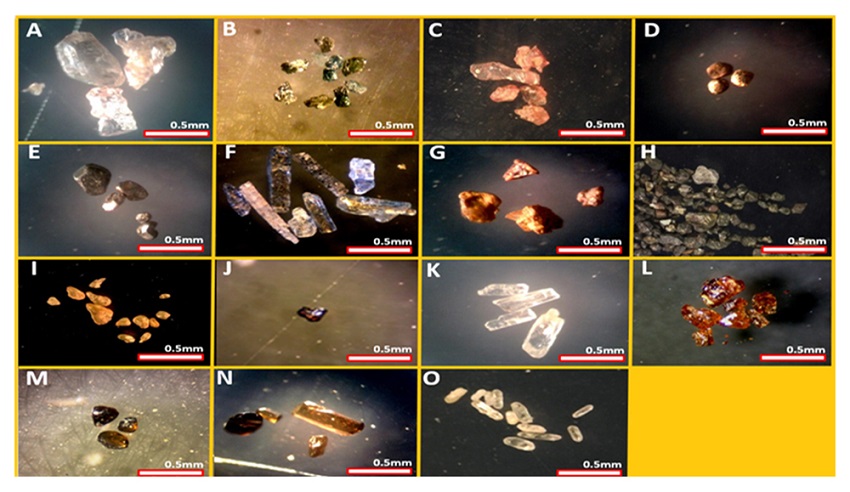 A total of 25.785 heavy mineral grains were separated and analyzed. These minerals were classified into 15 species: 11 translucent minerals and 4 opaque minerals (Figure 2). Limonite, hematite, and magnetite constitute the opaque group, where ilmenite is the predominant mineral across the ESCS. Moreover, the dominant translucent mineral in the study area is sillimanite. Zircon, tourmaline, epidote, monazite, garnet, staurolite, rutile, titanite, andalusite, and kyanite also constitute the translucent mineral group. The ZTR index was used to analyze the mineralogical maturity. The three distinct sectors displayed values below 75% (Table 1), being classified as compositionally immature sediments.