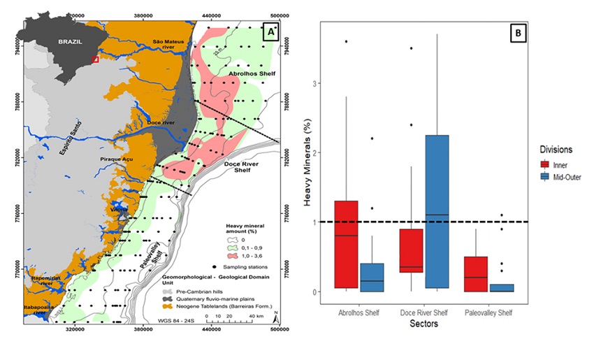 The map and boxplots presented in Figure 3 show the heavy mineral amounts across the ESCS. According to Palma (1979), sedimentary deposits with 1% or more heavy mineral contents are classified as marine placers. The values varying between 0-3.6% were subdivided into three intervals. The highest heavy mineral contents dominated the mid-outer Doce River Shelf (30-50 m in water depth). The lowest heavy mineral contents were observed in the mid-outer Paleovalley Shelf. However, the inner Abrolhos Shelf (water depth < 30 m) expressed heavy mineral contents compared to the same water depth range of the other sectors.