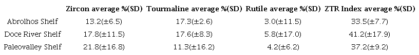 The source area is first subjected to weathering, and then the resulting sediments are transported, selected in accordance with the prevailing hydraulic conditions, and deposited across the shelf (Morton 1985). Although there are different sedimentary regimes in the ESCS, there is no qualitative differentiation in the heavy mineral assemblages in the study area. The 15 heavy mineral species identified in the ESCS highlighted the predominance of ilmenite. However, each heavy mineral species is heterogeneously distributed in the ESCS sectors. The Doce River Shelf and Abrolhos Shelf (supply regime) exhibit higher average abundances compared to that of the Paleovalley Shelf (accommodation regime). The data illustrate that there is a quantitative heavy mineral assemblage differentiation between the sedimentary regimes. This difference, is likely due to the Doce River influence on riverine sediment discharge (modern and ancient), where more than 70% of the total ESCS riverine reaches a maximum of 133 x 106 tons in the wet season (Oliveira & Quaresma 2017). The ZTR index analyses demonstrated that the sedimentary deposits are immature (ZTR < 75%). This was the expected result due to the great variety of heavy minerals species that contain both stable and unstable minerals. The low ZTR index values suggest a short transport distance from the source area to the depositional environment and/or the low energy of the sedimentation environment (Hubert 1962; Oni & Olatunji 2017; Pettijohn et al. 1973; Sulieman et al. 2015).