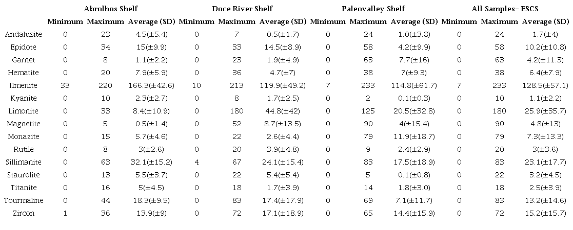 The spatial distributions of the heavy mineral types are heterogeneous in each ESCS sector. However, the assemblage of heavy minerals in each sector is similar take into consideration the different heavy minerals each species average. In the accommodation sector as the Paleovalley Shelf, where there is space to accommodation of sediments, only the monazite (11.9±18.7, 58.9%), and garnet (7.7±16, 71.9%) demonstrate higher average abundances compared to those of the other two sectors (Table 2). Even in the supply sectors as inner Abrolhos and Doce River shelves, where sediments are deposited, there are differences in the distributions of these minerals. Among 15 heavy mineral types, nine species have a higher average abundance in the Abrolhos Shelf: andalusite (4.5±5.4, 75%), epidote (15±9.9, 44.5%), hematite (7.9±5.9, 40.3%), ilmenite (166.3±42.6, 41.4%), kyanite (2.3±2.7, 56.1%), sillimanite (32.1±15.2, 43,5%), staurolite (5.5±3.7, 50%), titanite (5±4.5, 58.8%), and tourmaline (18.3±9.5, 42.7%), while in Doce River shelf, limonite (44.8±42, 60.7%), magnetite (8.7±13.5, 65.9%), and rutile (3.9±4.8, 41.9%) stand out compared to the other sector distributions (Table 2).