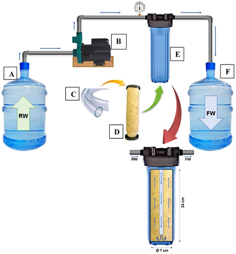 The system consisted of a raw water tank, a pump (¼ CV), a pipe that connected the elements, a support structure containing the filter element of the system, and the filtered water tank (Figure 1). To make the filtering element, a commercial filter tube was used, measuring 24 cm in height, 3 cm in diameter, and three blankets of NW 10 sample. After the carding process, three carded CM blankets were added to an aluminum container, resulting in a single blanket of approximately 65 g of material. The material was moistened with resin containing 10% solids. The blanket was wrapped in a commercial filter tube and taken to a drying and sterilization oven, where it remained in the drying process at 70 °C for 12 h. After drying, the filter material had a diameter of 7 cm, a height of 24 cm, a surface area of 528 cm2, and a total volume of 692 cm3.