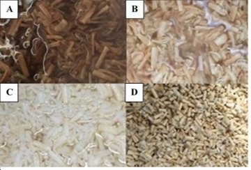 Posteriorly the three cooking step of CBR a dark liquor was released which originated during the cooking process, obtaining as a final product a clarified material (Figure 2A, B and C). After drying this material, the CM sanitized was obtained (Figure 2 D). Cellulose acetate, the main input of RB, when placed in an alkaline medium undergoes hydrolysis reaction resulting in the formation of cellulose (d’Heni Teixeira et al. 2017). The methodology employed resulted in obtaining 50% of cellulose about the initial mass of CBR used. This fact happened because this reaction removed the lignin, dissolved other toxic contaminants present, in the butt cigarette (d’Heni Teixeira et al. 2017; Mehta et al. 2006).