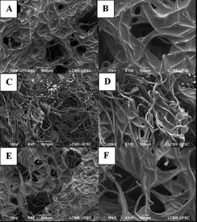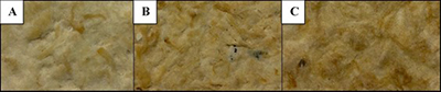 Subsequently, the fiber layers containing about 22 grams were wet bonded using a styrene copolymer acrylic resin (with initial solids concentration of 40%) using three solids concentrations (10, 20 and 30%). The surface of sample NW10 (Figure 3A) demonstrated greater flexibility, greater uniformity of the fiber layer, in addition to a smoother surface compared to other samples (Figure 3B and 3C). This fact may be associated with the concentration of solids, that is, the resin used was more diluted. In the case of the NW20 sample, a more rigid layer was identified, in addition to spots with lack of fibers (Figure 3B). In relation to NW30 samples, an irregular surface was identified, in addition to stiffness, showing ruptures in the fabrication of the filter element (Figure 3C).