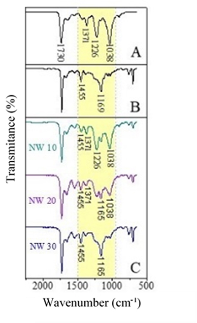 When producing nonwovens using increasing proportions of solids content in the resin (10%, 20% and 30%), a gradual reduction in the peaks of 1038 and 1226 cm-1 and an increase in the peak of 1165 cm-1 were identified (Figure 4C). In addition, there is a reduction in the peak of alcohol O-H stretch by 1371 cm-1 and an increase in the O-H stretch of carboxylic acid by 1455 cm-1. In this sense, it is identified that as the solids concentration of the resin increased, the absorption bands became weaker as well as the stretching vibrations of the O-H bonds. Therefore, the lower the presence of hydroxyls, the greater the stiffness of the non aluminum woven fabric and the lower the material’s absorption capacity.