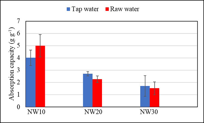 The results showed a strong relationship between the solids content of the resin and its ability to absorb liquids (Figure 6). The absorption values varied from 1.52 to 4.99 g g-1 for RW and between 1.71 to 4.01 g g-1 for tap water. The greatest absorption capacity was obtained for NW10 (4.99 and 4.01 g g-1) in relation to NW20 (2.25 and 2.70 g g-1) and NW30 (1.52 and 1.70 g g-1) respectively. This behavior occurred both for both samples (tap water and RW).