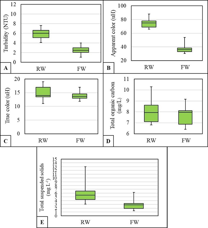 In general, the system showed a satisfactory removal of turbidity, color, and suspended solids (Table 2). There was no significant change in relation to the value related to the absorbance of FW compared to RW. This parameter is indicative of the presence of dissolved organic matter (Souza. 2015). Some compounds like humic acid can absorb light at ultraviolet wavelengths. In this sense, the absorbance result is probably related to the existence of humic materials presents in the RW.