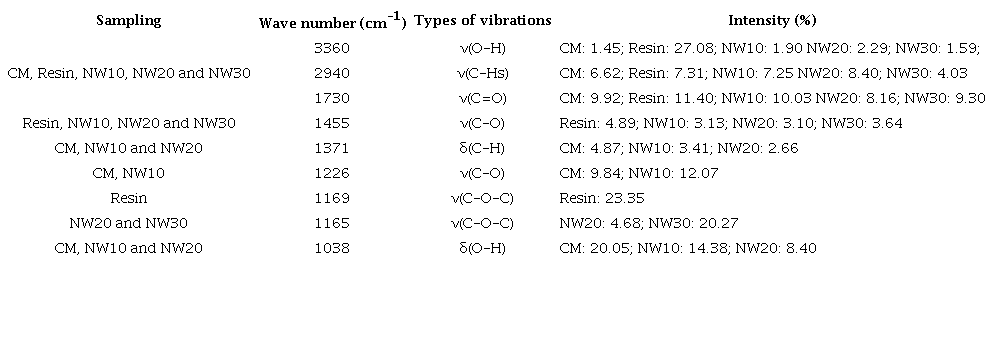 In order to evaluate the functional groups, present in the samples, FTIR analyses were performed for the resin CM and NW10, NW20, and NW30 samples (Figure 4 and Table 1). In general, a peak of 3360 cm-1 was observed for all samples, which is associated with the stretching vibrations of the O-H bonds, attributed to a hydrogen bond. The 2940 cm-1 peak is characteristic of the stretching vibrations of the aliphatic C-H bonds. The carbonyl group appeared at 1730 cm-1, characterized by the stretching vibration of the C=O bond, strongly suggesting the preservation of cellulose acetate.