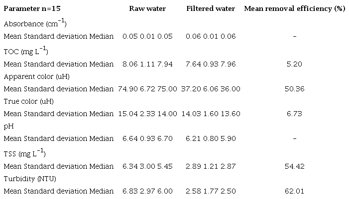 The filtration system removed 62.01%, 54.42%, 50.36%, 6.73% and 5.20% for turbidity, TSS, apparent color, true color and TOC respectively;