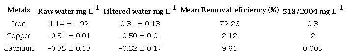 Table 3 shows the treatment performance regarding the removal of metals. In general, all metals showed concentrations below the maximum permitted values contained in Ordinance 518/2004 (BRASIL, 2004). Higher treatment performance was identified for iron (72.26 %), while the removal of copper and cadmium was in the order of 2.12 % and 9.61 %. The removal of metals was considered satisfactory because it is a filtration system coming from a CBR.