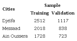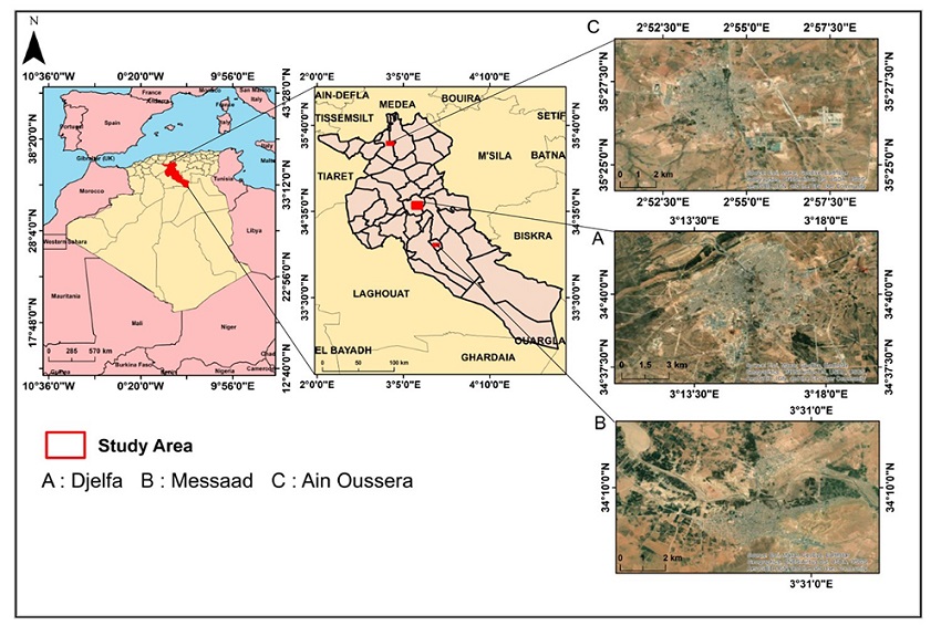 The study area located, in the central part of Algerian highlands between the Tel Atlas and the Saharan Atlas. The area includes 3 cities of Djelfa province as shown in ( Figure 1) namely Djelfa, Messaad, and Ain Oussera. Djelfa province is located 300 Km from the South of Algiers, at an average altitude of 1180m above sea level. The climate of the study area regions is semi-arid, and arid, with rainy cold winters, dry and warm summers with an average annual precipitation of 200 - 400 mm, and most of it falls between November to March. The annual air temperature is generally above 20°C in the coldest months, the minimum temperature is -4°C, while it can exceed 37°C in the warmest months. The residential land use type is the most dominant land use in urban area, comprising buildings constructed with locally available materials such as gravel, stone, compacted soil, sand, and quarry sand, also it is characterized by vast bare soils and a sparse vegetation density, due to the irregularity and scarcity of precipitations, which is characteristic of the steppe regions. Djelfa is the principle district of Djelfa province, It is located between 34°40' 13" of latitude North and 03°15' 01" of longitude East, with a surface of 24.47 km2. Messaad, located at 76 km from the South-East of Djelfa city, between 34° 8′ 31″ - 34° 10′ 52″ of latitude North and 3° 27′ 58″ - 3° 31′ 48″ of longitude East, its covers approximately 7.90 km2. Ain Oussera is located 100 km from the North of Djelfa city, extended between 35° 26´ 56″ of latitude North and 2° 55´ 16″ of longitude East, with a surface of 13.76 km². The selection of these cities, includes several criteria such as the geographical settings, climatic conditions, land cover/use characteristics, and various physical sizes.
