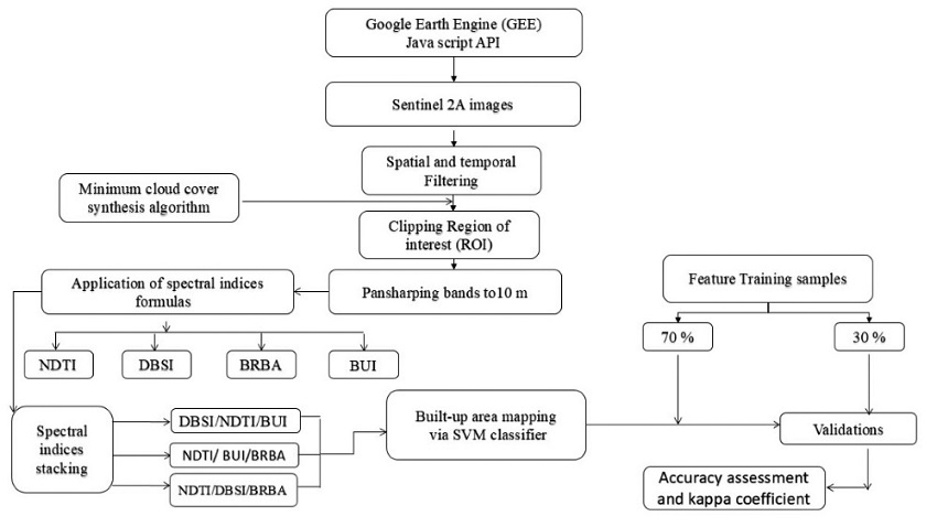 In this study, we are attempting to put the process of separating urban areas and bare land into a test, in order to achieve the best and most effective multi-index dataset including the NDTI index, and to achieve the maximum accuracy of extraction through the combination of three spectral indices among the BRBA, BUI, NDTI, and DBSI. For this purpose, we explored a rapid and accurate mapping of built-up of semi-arid regions via Google Earth Engine (GEE) which provides a cloud platform to access and seamlessly process a large amount of freely available satellite imagery including those acquired by the sentinel 2A remote sensing satellite, as well as processing power to analyse data at planetary scale. GEE consists of a multi-petabyte of geospatial and tabular data, with a JavaScript, Python-based API (GEE API), and algorithms for supervised image classification, which we selected among them for our study the SVM algorithm.