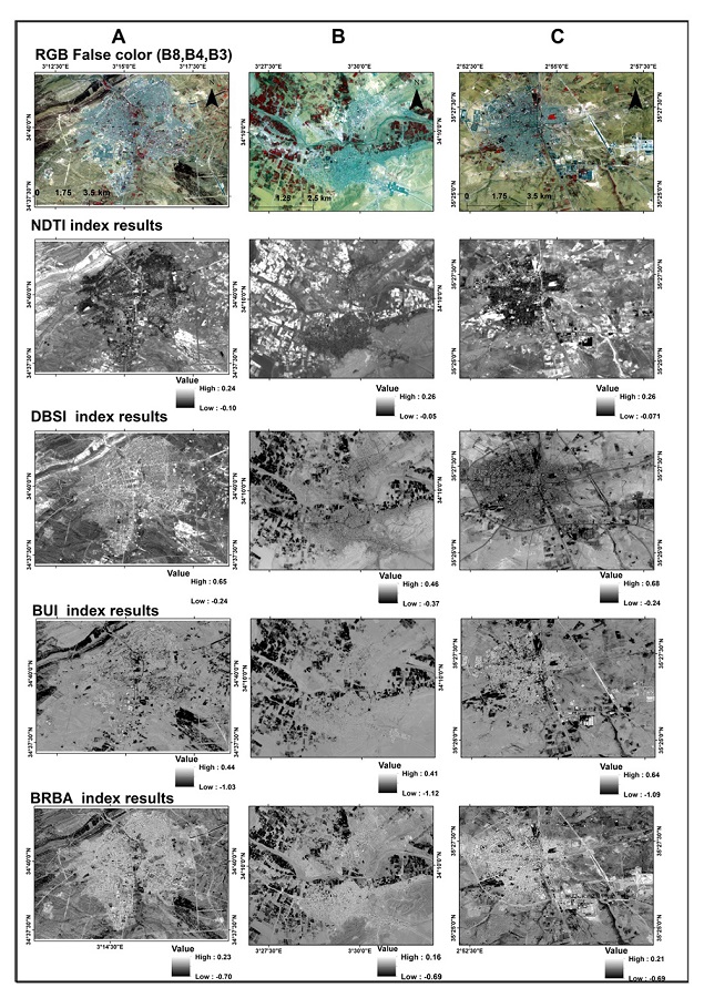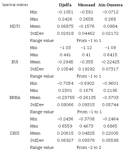 As shown in Figures 3 and 4, the Spectral indices can highlight and separate the built-up areas from forests and grasslands. Nevertheless, in some cases, some indices cannot distinguish the built-up areas from bare lands. In Djelfa city, the BRBA index provided high contrast difference between the urban area with positive values and white, bright grey, light grey tones, and bare land with negative values and dark grey tones, compared to the other indices. On the other hand, the DBSI index was used in arid regions to determine bare soil, highlighted bare land, and built-up area with moderated positive values in the cities of Messaad and Ain Oussera. The results also indicate that the BUI and NDTI provided a low difference between the built-up areas and the bare lands, no significant contrast was observed in index images between these two regions. In addition, Table 2 presents the statistical values of the four spectral indices used, where it is noteworthy that for all indices, the standard deviation values are low.