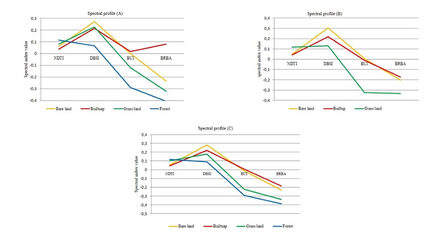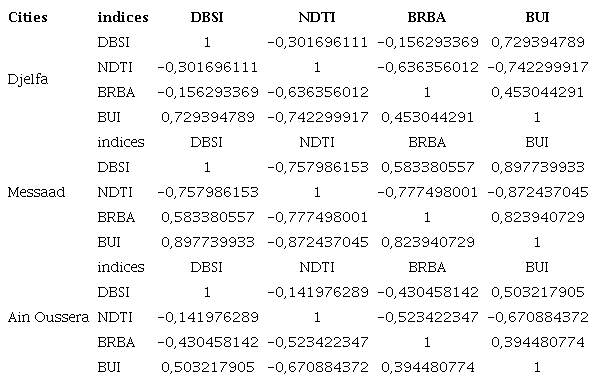 The correlation between the four spectral indices is shown in Table 3. It is observed that there is a very good correlation between the BUI-NDTI, and the BRBA-NDTI pairs of indices are correlated negatively.