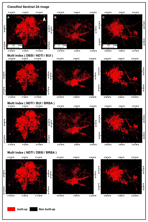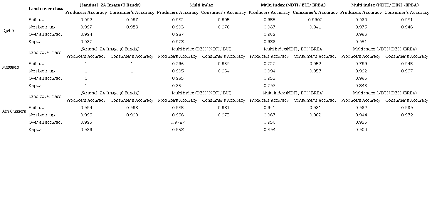 The confusion matrix resulting from the accuracy assessment is shown in Table 6. The results indicated that the built-up area was better mapped using multi-index (DBSI/ NDTI/ BUI); the overall accuracies achieved are 98.7% in Djelfa city, 96.5% in Messaad city, and 97.87 % in Ain Oussera city, the kappa coefficients achieved are 97.3%, 85.4%, and 95.3%, respectively regarding the assessment of the classification quality of each class, which aids in comparing the accuracy of both classes, between the multi-index dataset developed and sentinel 2A image. We note that in terms of the precision of consumers accuracies in built-up areas, the multi-index (DBSI/ NDTI/ BUI) has also proved high percentages in the cities of Djelfa, Messaad, and Ain Oussera, it achieved 99.5%, 96.9%, and 98.1%, respectively. Although it is also noted that the multi-index (NDTI/ BUI/ BRBA) in Ain Oussera city showed a similar value of consumers accuracy to the multi-index (DBSI/ NDTI/ BUI). Additionally, the producer accuracies of built-up class of multi-index (DBSI/ NDTI/ BUI) in the cities of Djelfa, Messaad, and Ain Oussera achieved 98.2%, 79.6%, and 98.5%, respectively, whereas in Messaad city the producer’s accuracy of built-up areas resulted from multi-index (DBSI/ NDTI/ BUI) showed a similar value to the multi-index (NDTI/ DBSI /BRBA).